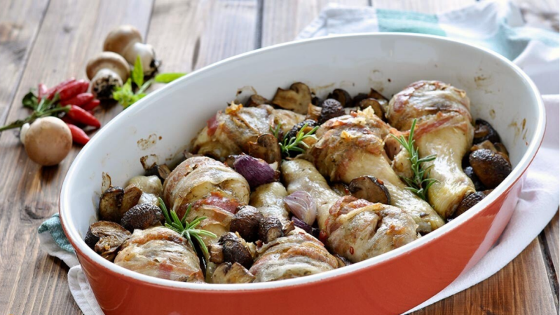 Le vostre cosce di pollo al forno con funghi e pancetta sono pronte, portatele a tavola ben calde… e buon appetito!